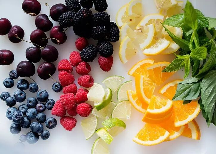 将各种水果如树莓、蓝莓、柠檬、橙子切成丁,