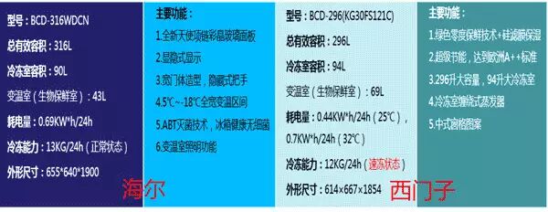 从档案看,海尔额定电量是0.69度/天,西门子在不同温度下耗电量不同,额定耗电量是0.44度/天(25℃)和0.7度/天(32℃),均为一级能耗,难分伯仲。冷冻能力也基本上平分秋色。