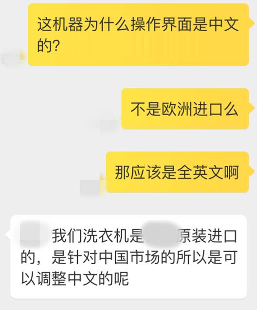 回到我们的主角家电身上。这是一台欧洲原装进口机器,欧洲制造(与产品相关的信息已部分遮挡)。欧洲制造,这台机器的机身字体却以中文为主,不用多说了吧?你买了这种产品,好意思和小伙伴介绍这是一台原装进口货吗?