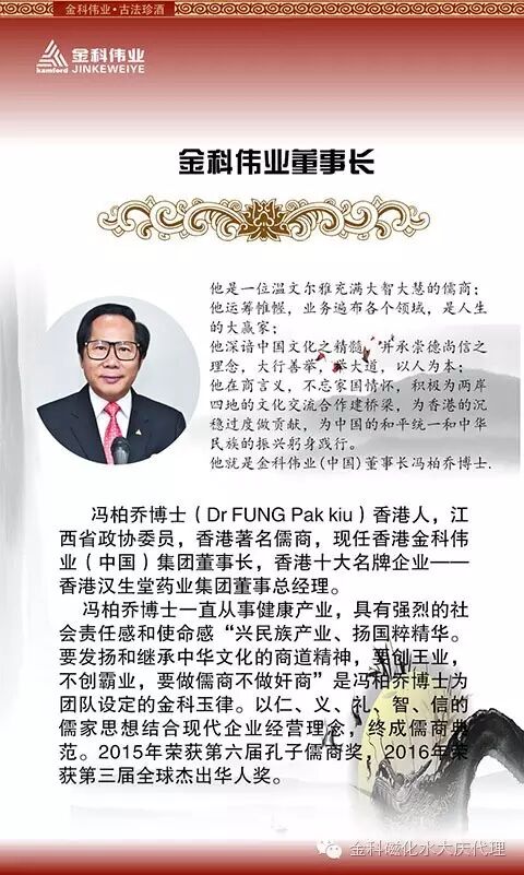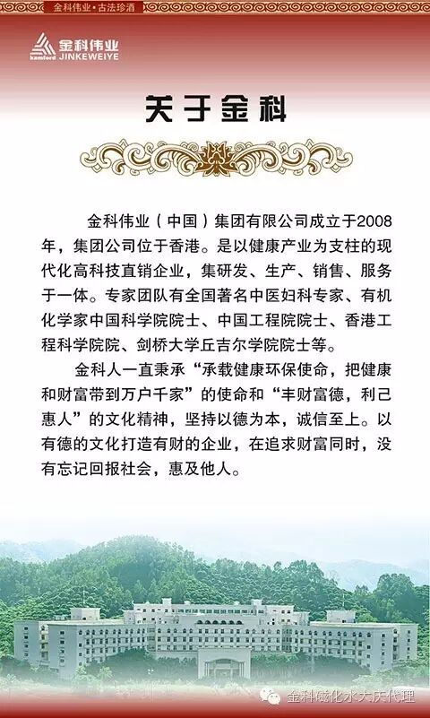 金科伟业(中国)集团有限公司成立于2008年。总部位于香港,是一家集研发、生产、销售、服务为一体的以健康产业为支柱的现代化高科技集团公司,公司自主研制的高磁化自来水器和离子空气净化器,有效解决了家庭自来水污染、水退化以及室内空气污染等难题。虫草系列保健品、酵素口服液以及化妆品、个人护理、家居清洁护理产品,均选料上乘、工艺先进,健康环保,赢得了用户的良好口碑。