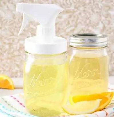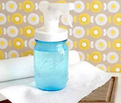 将清洁剂装在喷雾瓶里,喷洒在冰箱、橱柜表面,轻轻一抹,擦除各类油渍。