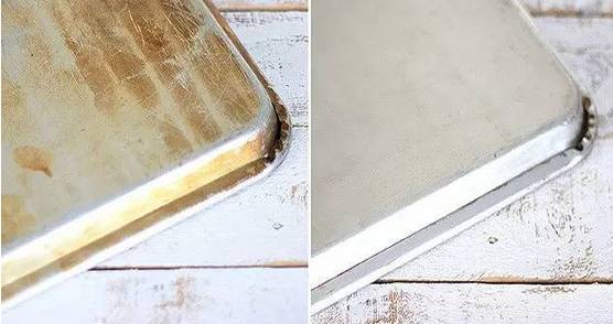 将生锈的铁盘泡在清洁剂溶液里,放置一整夜,隔天用清水或柠檬水清洗,铁盘又和新的一样啦。