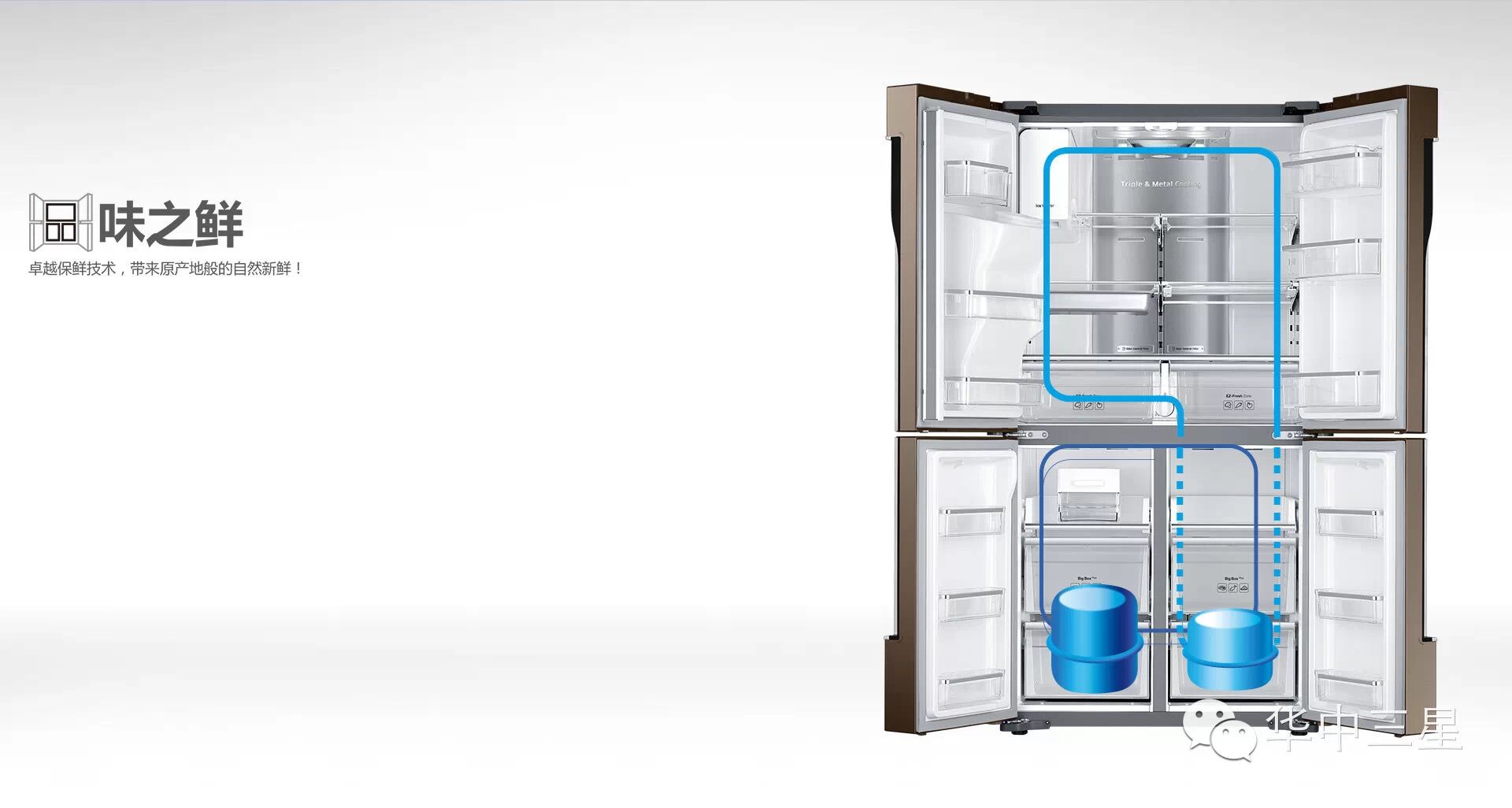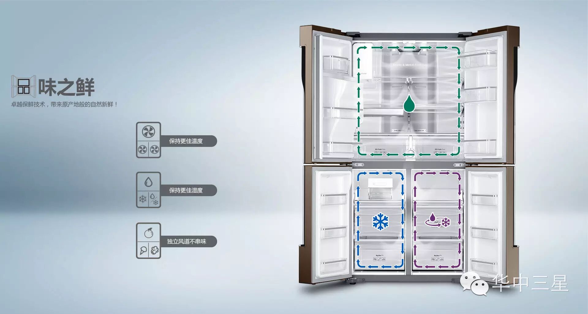 大容量冰箱当然要有更佳制冷表现。三星革命性无霜保湿三循环技术,快速制冷,精确控温,持久保持温度和湿度,独立不串味,各有各新鲜。