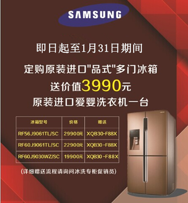 即日起至1月31日期间,购买原装进口“品式”多门冰箱,送价值3990元原装进口爱婴洗衣机一台!