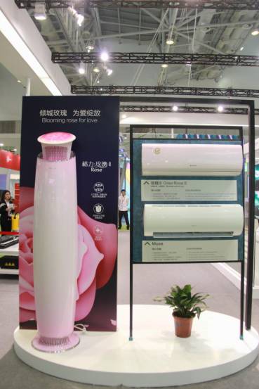格力•玫瑰-Ⅱ空调专为新婚夫妇定制,“头顶”22朵的纯手工打造的玫瑰装饰,出风口设计独特(下出风口由机体背面旋转至正面打开),每当空调开启,上出风口由主机徐徐升起,犹如一朵破土而出的花朵。