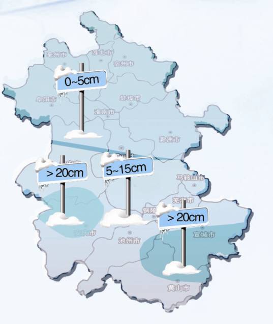 气象部门预计:20~22日我省江淮南部和江南部分地区将有大雪到暴雪,期间最大积雪深度:淮北和江淮北部0~5厘米,其他地区5~15厘米,其中大别山区和江南部分地区超过20厘米。