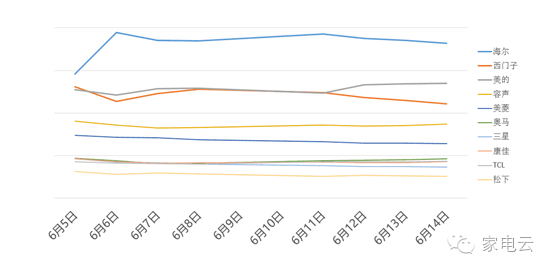 从销售占比数据上看,在消费者心目中长期代表着品质的西门子冰箱,一开始即为消费者所青睐,一度在6月5日领先美的,占据了排名第二的位置。然而,西门子冰箱的这个第二的位置并不牢固,随着海尔冰箱在6月6日开始发力,西门子冰箱和美的冰箱的销售均受到冲击,西门子冰箱的销售甚至因此落在美的冰箱下风,销售排名降到第三,之后,尽管西门子冰箱再度奋起直追,但也基本只能和美的冰箱持平。从下图可以看出,从6月8日到6月11日,西门子、美的两大冰箱品牌的销量占比数据一直处于胶着状态,交替领先,谁也没将对方甩开,销售曲线几乎重合。