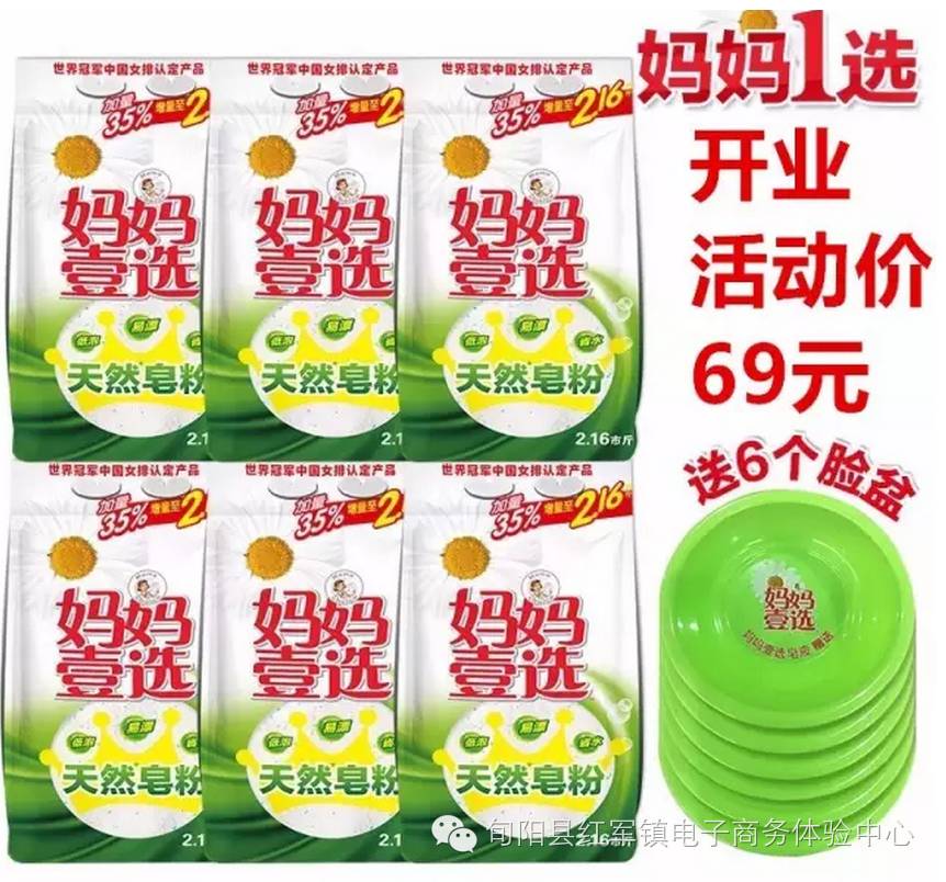 打开农村淘宝搜索:妈妈壹选天然皂粉1.08kgX6袋送6个脸盆 开业价 69元