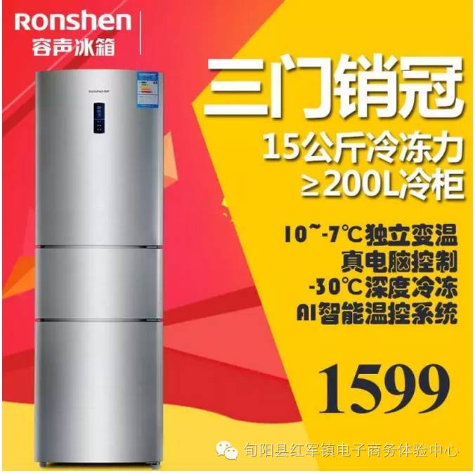 打开农村淘宝搜索:Ronshen/容声 BCD-228D11SY 冰箱 家用 三门 电脑温控 软冷冻 开业价1499元