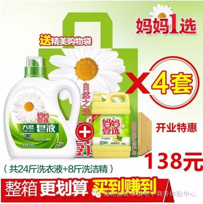打开农村淘宝搜索:妈妈壹选( 3kg洗衣液+1kg洗洁精)× 4 开业价:138元