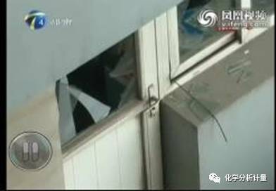 爆裂的玻璃片飞散至室内各处,其中一小块玻璃片高速撞击实验室门上的玻璃,并将该门上的玻璃击穿,可见爆炸的威力巨大。