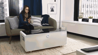 这款自带冰箱的茶几,可以放上家里所有的冷饮。手机没电也不用怕,茶几有USB和插头。