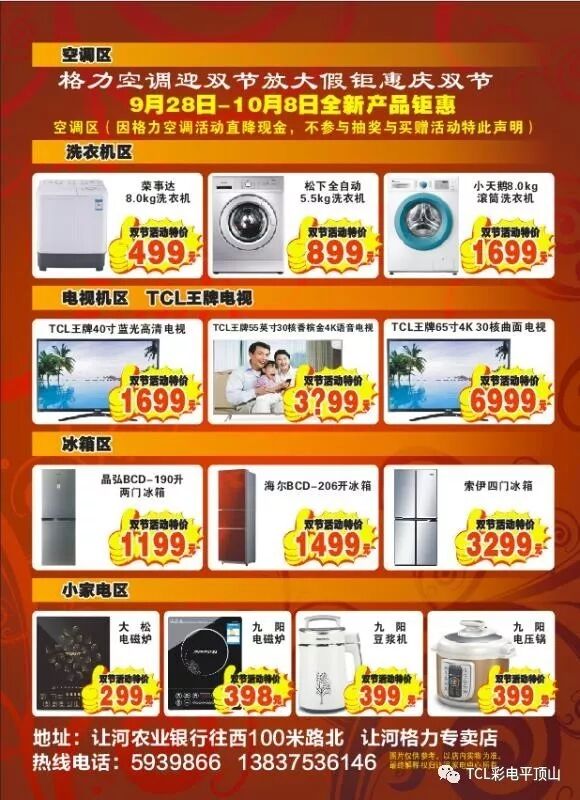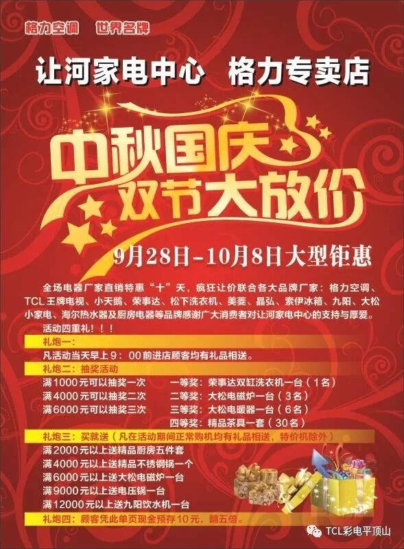 震撼全城 9月28-10月8日让河家电中心(格力专卖店)中秋国庆盛典,买家电的最佳时机,TCL电视&格力空调&小天鹅、荣事达洗衣机&晶弘、索伊冰箱&海尔热水器&九阳小家电联袂打造家电盛宴。