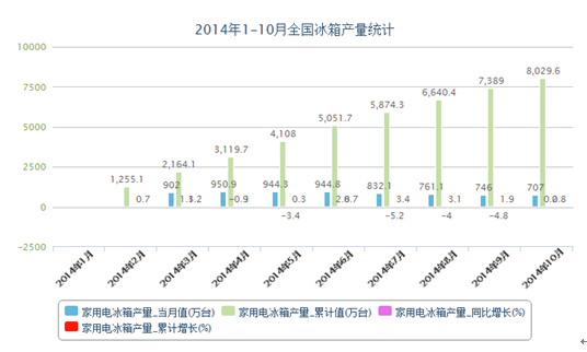 据国家统计局最新统计数据显示,2014年1-10月全国冰箱实际累计产量为8029.6万台,累计增长0.8%。其中十月份冰箱全国产量为707万 台,同比增长仅0.2%,前十个月中只有三个月份实现正增长,其他七个月份均为负增长。据秋实观察测算,2014年全年冰箱产量有望达到9500万台,同 比增量160万台左右,同比增幅约为1.7%。市场产能释放趋缓,尽显市场疲软。