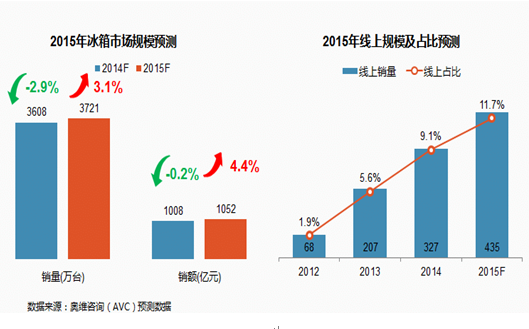 据奥维咨询(AVC)推总数据显示,2014年1-10月,冰箱市场零售量规模3146万台,同比下降3.3%,其中线下终端销量2833万台,同比下降 7.7%,线上销量313万台,同比大幅增长69.1%,线上渠道占比近10%;零售额规模895亿元,同比上涨1.6%,其中线下843亿元,同比微降 0.8%,线上51亿元,同比增长71.0%,2014年线下渠道下滑成定局,线上增长成常态。