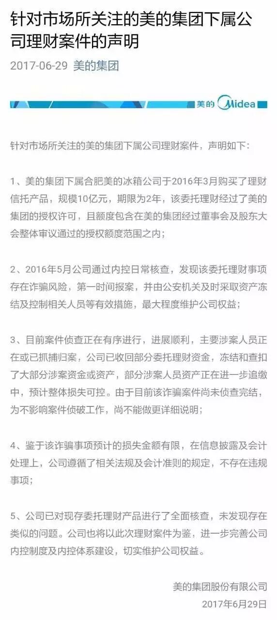 美的称,公司下属合肥美的冰箱公司在2016年3月购买10亿元理财信托产品,2016年5月通过内控日常核查发现存在诈骗风险并第一时间报案。