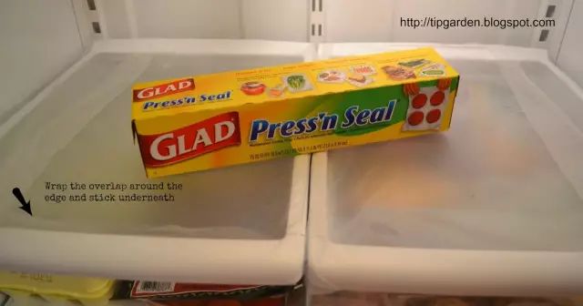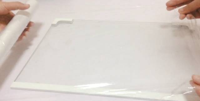 最关键的一步来了。想要以后再也不用清洁搁板,我们可以用保鲜膜把搁板包起来再放回冰箱。