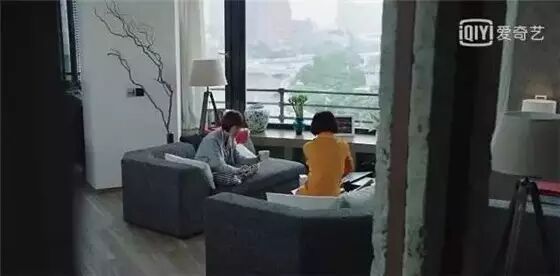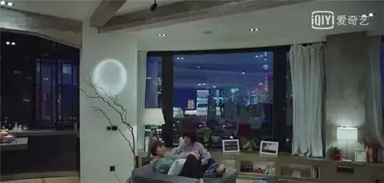 客厅有个巨大的飘窗,面对着无敌江景,同时飘窗下面作为了储物空间。灰色沙发和黑色茶几摩登时尚,很符合唐晶作为商业精英理性的性格。