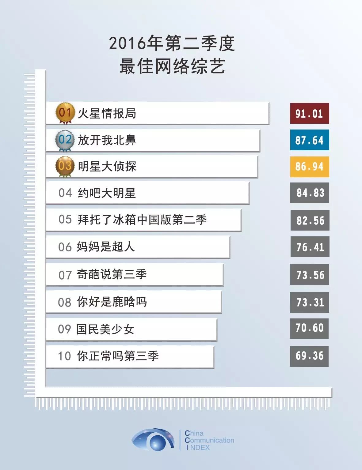 《火星情报局》《放开我北鼻》《明星大侦探》三档综艺分别位列第二季度最佳网络综艺排行榜前三名。对比同季度最具影响力网络综艺排行榜发现,《火星情报局》《放开我北鼻》两档节目不论是覆盖面、传播力还是口碑影响力和综合表现,都比其它节目突出。