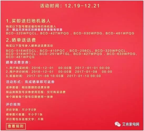 晒图送200元话费券,是此次晶弘推出的又一项福利。参与此项活动的机型覆盖面更广,涉及多个容积段产品,包括BCD-516WEDCL,BCD-410PQC,BCD-256CL,BCD-320WPQCL,BCD-316WPTCL等。用户在参与此项活动时需注意仔细阅读活动要求,如京东页面注明,返券面值为相应面额的话费京券,单个顾客每个型号仅限使用一张券。评价规则也规定,评价字数不少于0字,晒单图片数量不小于1张。