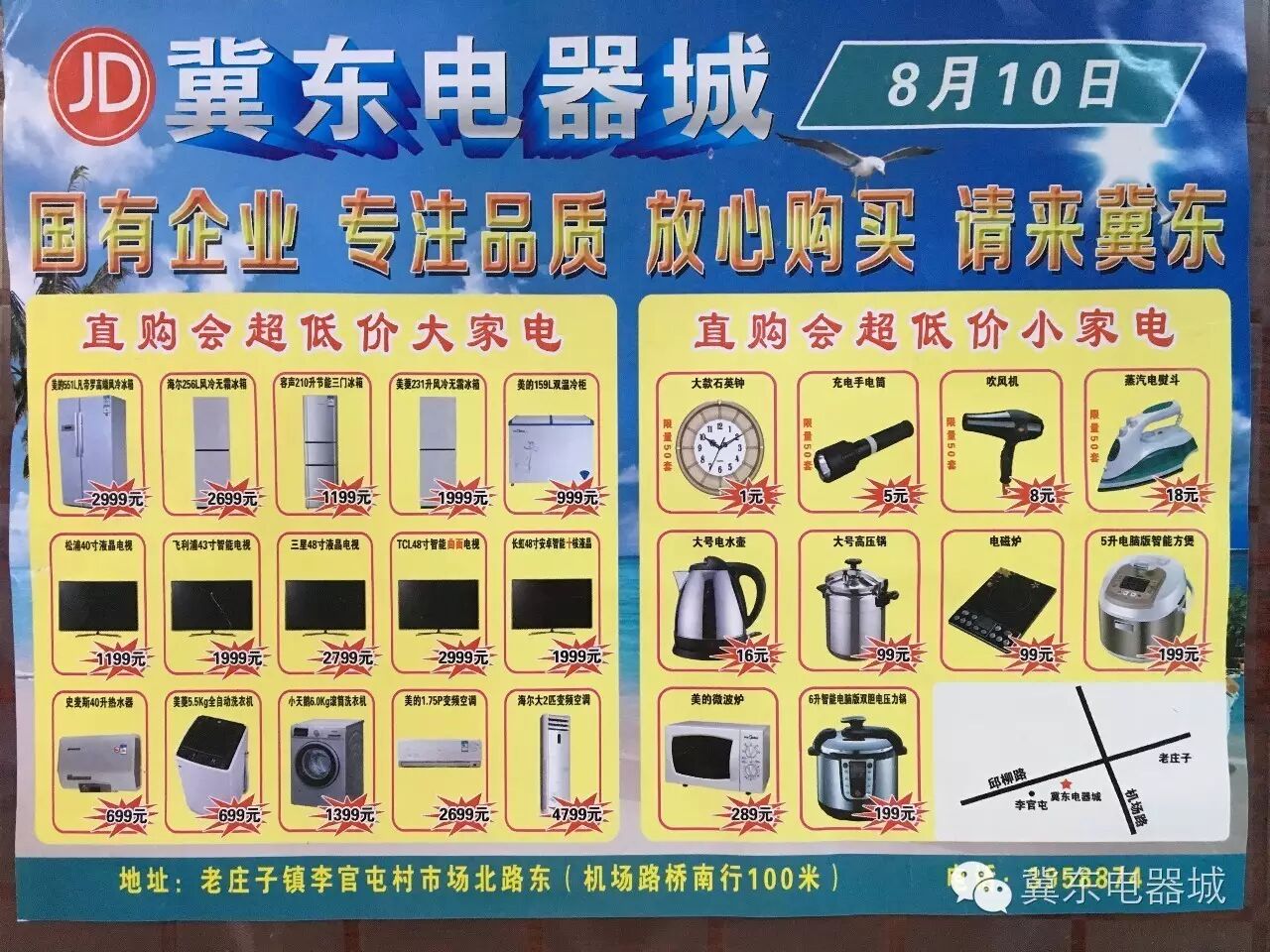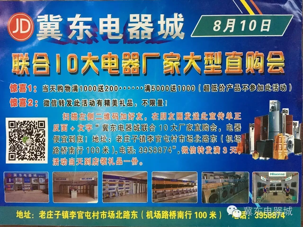 为答谢各位新老顾客,8月10日,李官屯冀东电器城联合10大厂家进行工厂直销活动。活动当天各种家电均有特价,价格让您目瞪口呆!活动仅1天,请各位抓紧时间。特价有限,莫失良机!