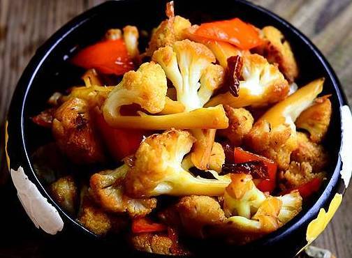 5、炒至菜花稍干时调入酱油和料酒继续炒至汁水收干。