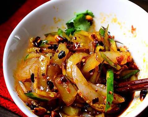 3、炒锅烧热下油,下入花椒、蒜片、干辣椒,煸出香味。