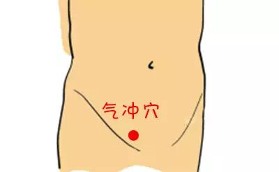 气冲穴位于大腿根内侧,在腹股沟稍上方,脐中下5寸,距前正中线2寸。按揉气冲穴,两侧交替进行,一直按揉到腿脚有热气下流的感觉为佳。