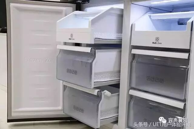 冷冻室空间分为三层,从上到下分别为多功能托盘、2个冷冻抽屉。实际体验为存取方便、食物分类科学,能起到避免食物堆积的效果。