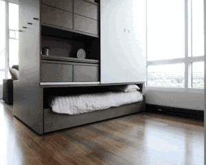 这套家具系统可以像机器人一样变形,只需一个按钮,隐藏在衣柜下的床铺便能拉出或推入,实现卧室与客厅的功能切换。家庭办公用的小书桌与电视等娱乐设施分别隐藏在柜子的两侧。家居产品的各项参数可以预先设定,比如同时出现理想的灯光效果与办公空间,这些都可以通过物理接口或手机APP进行调节。