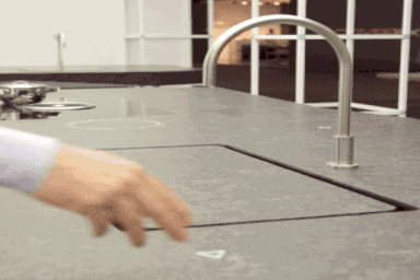 这个操作台是由石英符合材料制成,石头桌面的下方被嵌入传感器,可以通过在上部的手势操作打开电炉,操作台的水槽部分是升降的模块,通过手势就可以调节水温。除了基础烹饪程序,这款智能操作台还可以提供手机无线充电等附加功能。