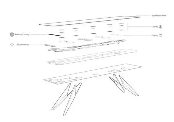 桌面采用陶瓷材质,陶瓷板的下部分有加热、冷却元件,再往下一层是电路板。这简直是一桌多用啊,既高级又节省空间。