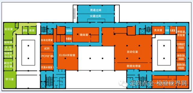 实验室的整体布局应符合医学实验室生物安全标准,在科室内部应划分污染区、半污染区和清洁区。同时流程科学合理,根据检验专业特色,污染程度不同,实验仪器的环境条件不同,合理规划分布。清洁区、半污染区、污染区之间的标示应清晰明显。电梯分清洁与污染,人流、物流、信息流分开,做到无交叉污染。